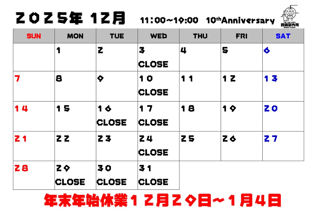 12月と年末年始の臨時休業を含めたお休みと営業時間変更は以下のとおりです。